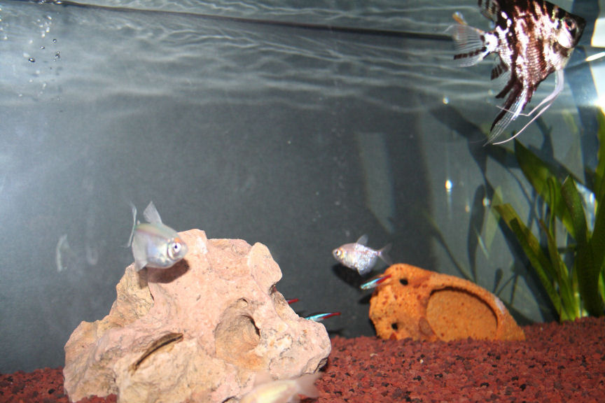 Després de tenir l’accident amb l’aquari i perdre tots els peixos menys un… ja hem tornat a omplir l’aquari! Ara, a part del supervivent escalar i les coridores que haviem comprat… ara hem posat una àmfora, un parell de monjitas, tres gupys i un otociclus. No se si s’escriuen així els peixos… en qualsevol cas, aquí poso una foto.
